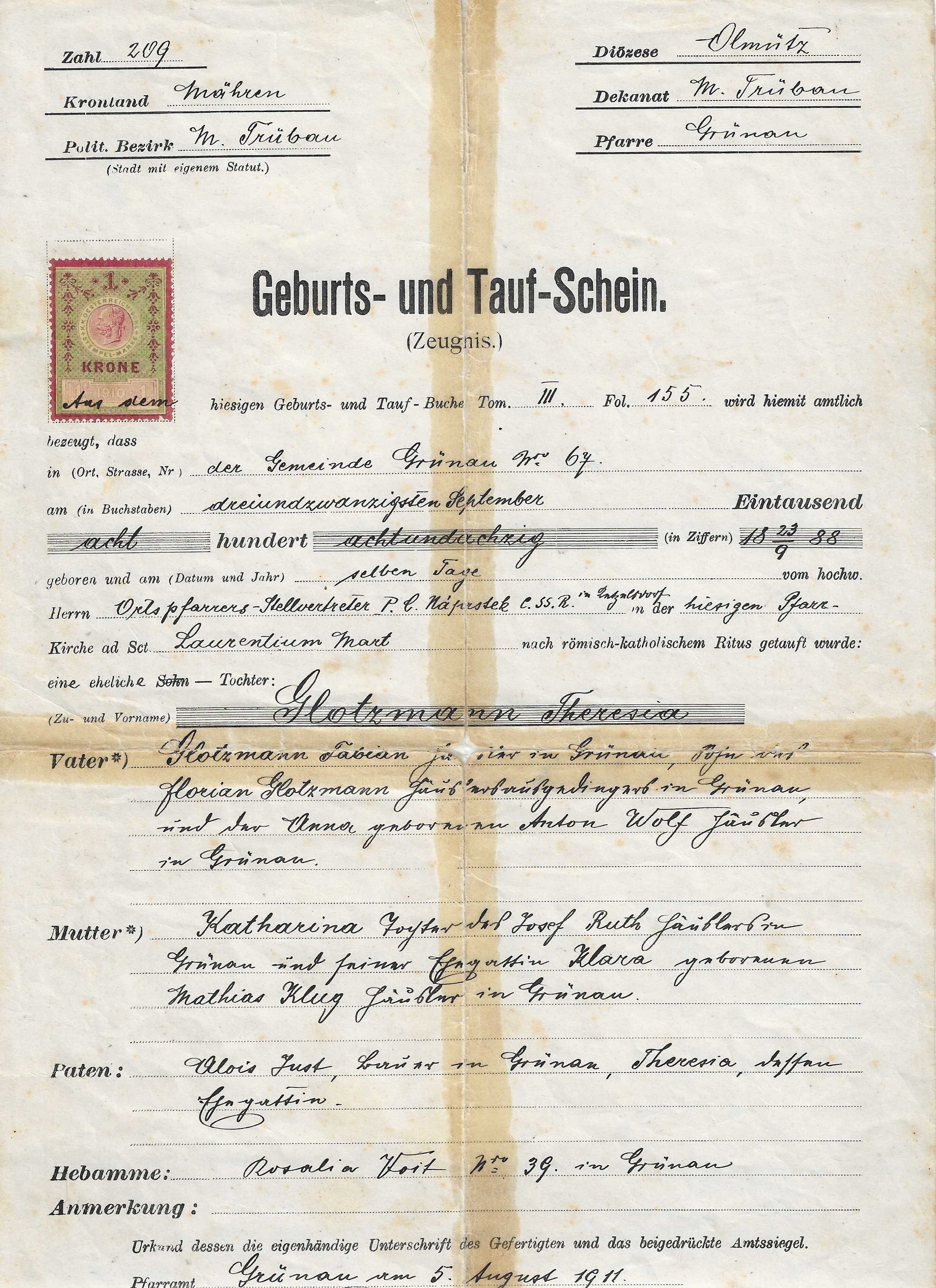 Taufe Theresia Glotzmann 1888-09-23 Taufregister Grünau