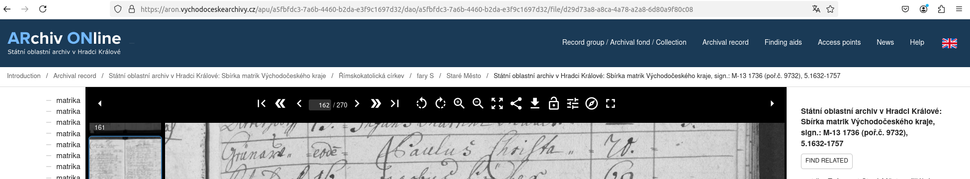 Web: Online Matrikel Tschechien Archiv Online ARON Státí oblastní archiv v Hradci Králové