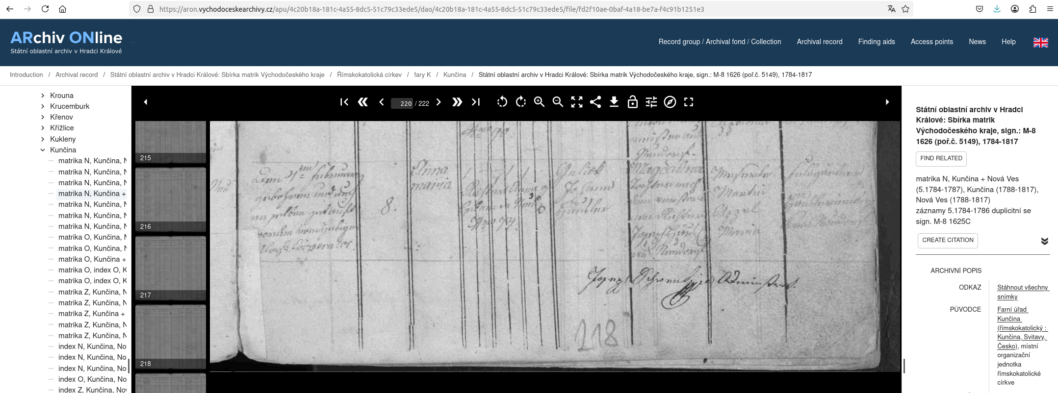 Státní oblastní archiv v Hradci Králové; Sbírka matrik Východočeského kraje (NAD 190); sign. M-8 1626 (poř.č. 5149); ukl. j. 4799; matrika N, Kunčina + Nová Ves (5.1784-1787), Kunčina (1788-1817), Nová Ves (1788-1817)