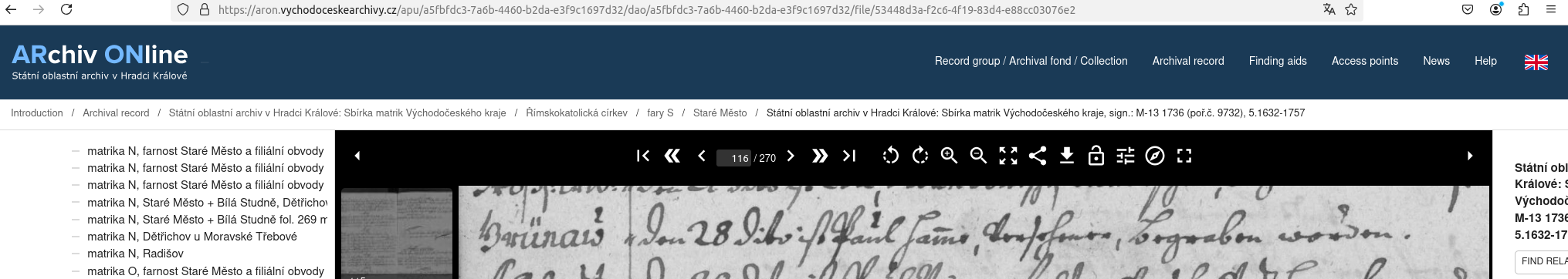 Web: Online Matrikel Tschechien Archiv Online ARON Státí oblastní archiv v Hradci Králové