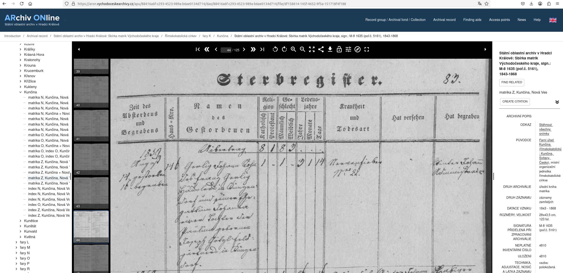 Státní oblastní archiv v Hradci Králové; Sbírka matrik Východočeského kraje (NAD 190); sign. M-8 1635 (poř.č. 5161); ukl. j. 4810; matrika Z, Kunčina, Nová Ves