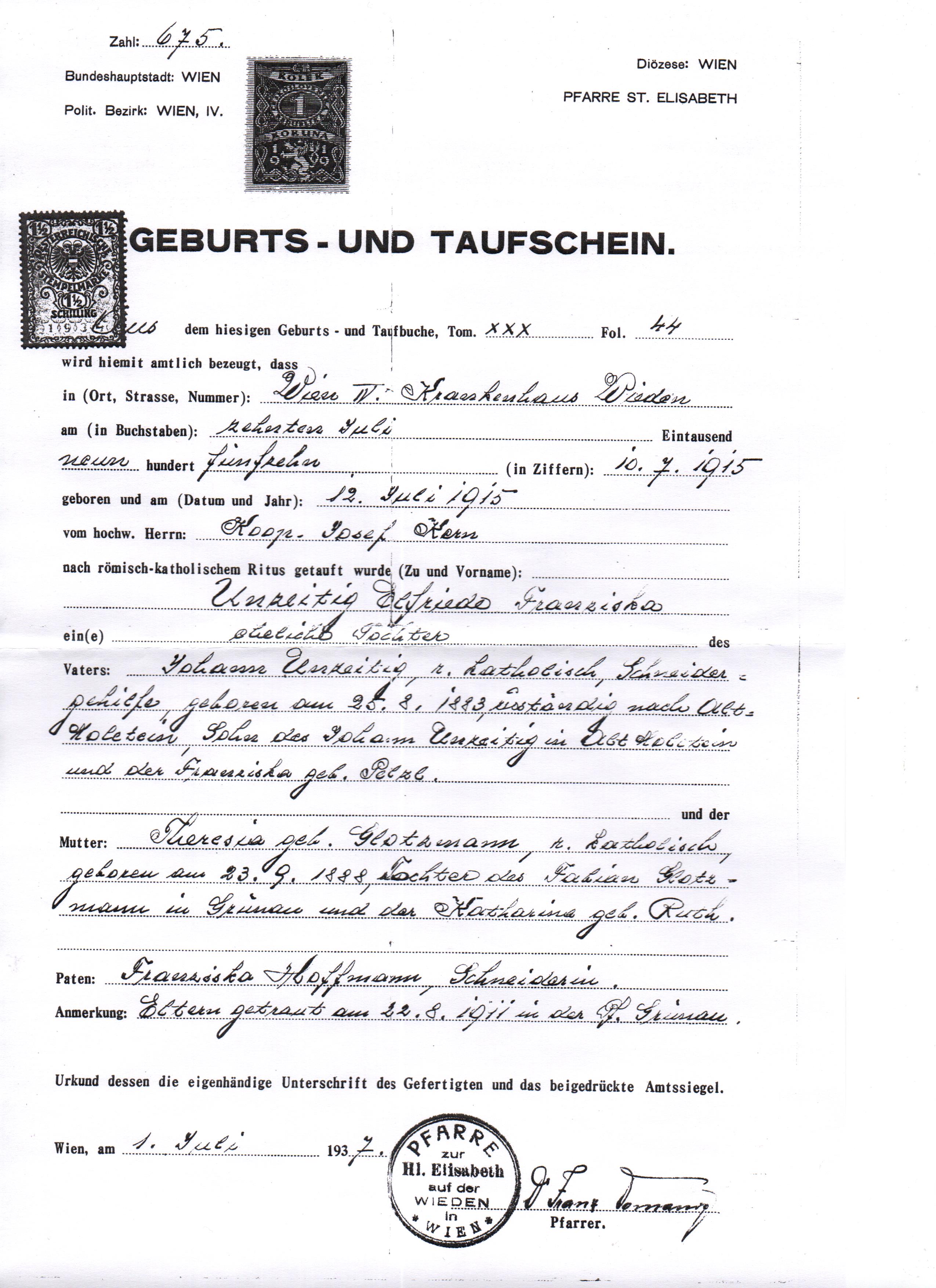 Taufe Elfriede Unzeitig 1915-07-10 Wien IV St. Elisabeth